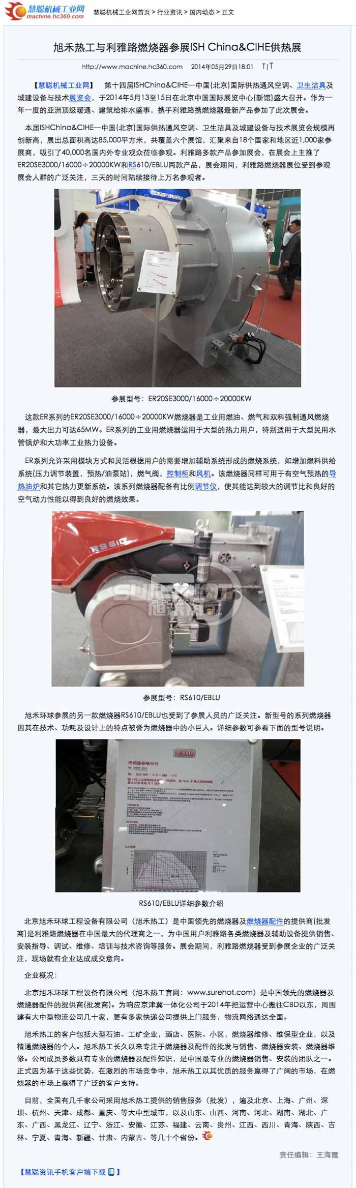 第十四屆ISHChina&CIHE─中國(北京)國際供熱通風(fēng)空調(diào)、衛(wèi)生潔具及城建設(shè)備與技術(shù)展覽會(huì),于2014年5月13至15日在北京中國國際展覽中心(新館)盛大召開。作為一年一度的亞洲頂級暖通、建筑給排水盛事,攜手利雅路攜燃燒器比較新產(chǎn)品參加了此次展會(huì)。